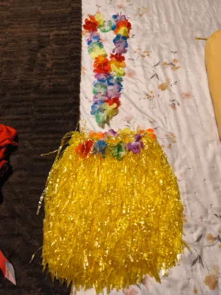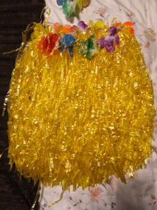 Conjunto de disfraz hawaiano para niña. - Incluye collar de flores y falda. - Falda de color amarillo brillante. - Flores de colores variados en el collar y la falda.