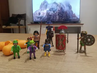 Conjunto de figuras de Playmobil. - Incluye personajes como Batman, Joker, Riddler y soldados romanos. - Figuras de colección. - Ideal para fans de Playmobil y superhéroes.