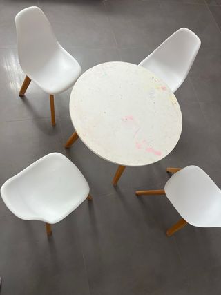 Conjunto de mesa redonda y cuatro sillas infantiles de color blanco. Ideal para que los más pequeños jueguen y aprendan. - Mesa redonda con patas de madera.( La mesa esta pintada con rotulador y con evidentes señales de uso, con un vinilo blanco queda como nueva) - Cuatro sillas blancas con patas de madera. En perfecto estado