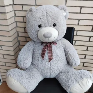 Este adorable oso de peluche es suave y perfecto para abrazar. Su color gris lo hace destacar. - Tamaño grande. - Lazo a cuadros en el cuello. - Material de felpa.