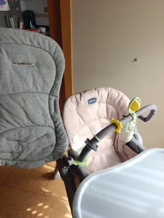 Trona Chicco Polly Magic Relax en color gris y rosa. - Asiento acolchado. - Bandeja extraíble. - Barra de juegos. - Plegable para fácil almacenamiento. está en perfecto estado excepto que la ser de piel se está pelando