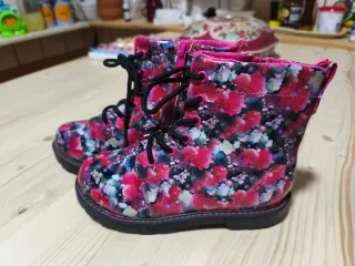 Botas con un estampado floral vibrante y llamativo. Perfectas para añadir un toque de color. - Diseño con flores rosas, blancas y moradas. - Cierre de cordones negros y cremallera lateral. - Detalle de ribete rosa en la suela.