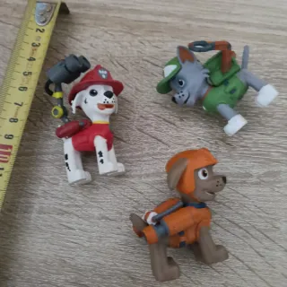 Lote de tres figuras de la Patrulla Canina. - Figura de Marshall con casco rojo y equipo de bombero. - Figura de Rocky con casco verde y mochila. - Figura de Zuma con casco naranja y equipo de buceo. Se venden juntos