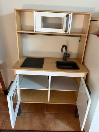 Cocina de juguete de madera de IKEA, ideal para los más pequeños. - Incluye horno, vitrocerámica, fregadero y grifo. - Puertas con tiradores. - Estantería superior con microondas.