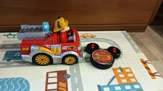 Camión de bomberos teledirigido de Mickey Mouse. - Diseño rojo brillante. - Incluye figura de Mickey con casco. - Mando a distancia con forma de orejas de Mickey.