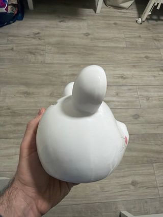 Adorable hucha con forma de ratón. - Diseño blanco con detalles en rosa y gris. - Orejas redondas. - Ojos cerrados y mejillas sonrosadas.