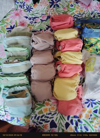 Lote de 19 pañales de tela Pop In, perfectos para un uso sostenible. Son cómodos y lavables. Los forros son de tela de bambú, close parent. Cada pañal tiene su forro interior y de regalo alguno más. Talla de 0 a 2 años - Varios colores disponibles: rosa, amarillo, beige y verde. - Diseño con broches ajustables. - Incluye absorbentes interiores.