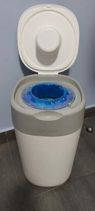 Papelera de pañales como nueva, regalo tres recambios y el que está puesto que está entero, se uso más como mesita de noche como se ve que como papelera
