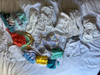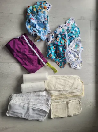 Lote de pañales de tela reutilizables de distintos tipos y accesorios. Ideal para iniciarte en el mundo de los pañales ecológicos sin hacer una gran inversión y pudiendo probar varios tipos. Con un lavado de desinfección a 60°C se sanitizan. Incluye: - Más de 30 pañales reutilizables (marcas Pop-in, Alvababy, CloseParents, Milovia, Bambino mio, MamiPlanet...) - Dos pañales de tela con forro impermeable para la noche. - Entre 30 y 40 insertos/absorbentes - 3 rollos biodegradables para la caca - 3 wet bags (bolsas impermeables para la calle) - han perdido parte de la impermeabilidad