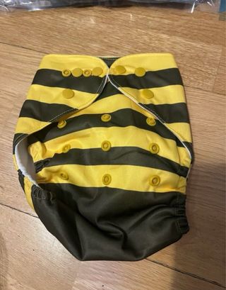 Pañal de tela reutilizable con cierre ajustable mediante broches. En buen estado general. Tiene algunas pequeñas manchitas (ver fotos), pero no afecta al uso. Gomas y broches funcionan correctamente. Tejido suave y transpirable. Opción ecológica y reutilizable.