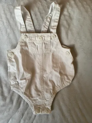 Peto de pana en color marrón, ideal para bebés de 0 a 3 meses, aunque yo lo pude usar hasta algo más de los 4 meses.Tiene un diseño cómodo y práctico, con apertura en las piernas para el cambio de pañal. - Tejido de pana suave. - Cierre con botones en los tirantes y ajustable a 2 alturas. - Puños de las piernas con estampado de rayas. - En muy buen estado. Dispongo de más ropa de bebé, puedo hacer lote.