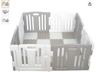 Parque infantil de plástico en dos tonos, blanco y gris. Ideal para crear un espacio seguro para los más pequeños. - Paneles de plástico resistentes. - Suelo con baldosas de espuma - Puerta de acceso con cierre de seguridad. Incluye alfombra puzzle de 16 piezas. Apto para usar en interiores o al aire libre. Medidas: Pieza (c/u): 57 x 67cm Montado (cuadrado, como en las fotos): 134 x 134cm Se entrega desmontado (ver última foto).