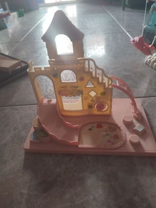 Este es un parque infantil con temática de castillo de Sylvanian Families. Es un set de juego de color rosa y amarillo. - Incluye tobogán. - Cuenta con escaleras. - Dispone de zona de arenero.