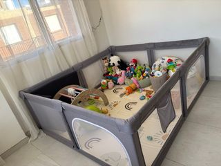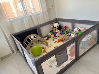 Parque infantil, medidas 125x125 Tiene una alfombra el en suelo y le compré aparte las losetas de colores para estar más acolchado Se abre una puerta con cremallera