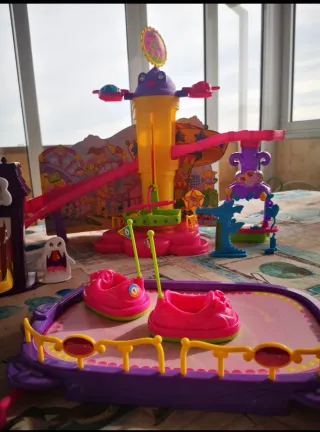Conjunto de juegos del parque de atracciones Pin y Pon. Incluye varias atracciones y accesorios. - Montaña rusa rosa. - Pista de patinaje con coches. - Casa de juegos. - Figura de personaje. - Accesorios varios.