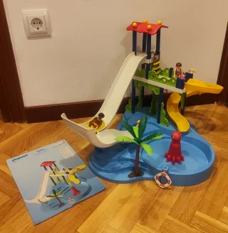 Divertido parque acuático de Playmobil con tobogán y accesorios. Incluye una familia de padre, madre, hijo, hija y bebé. Lo único que no tiene la caja del embalaje original