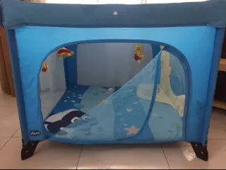 Parque cuna de la marca Chicco en color azul usado un par de veces. - Estructura de metal y tela. - Laterales de malla transpirable. - Fácil montaje y no pesa nada. - Plegado no ocupa mucho espacio.