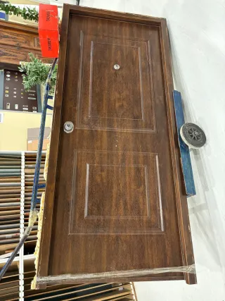 Puerta de seguridad con acabado en madera. - Diseño con paneles. - Incluye mirilla y cerradura.