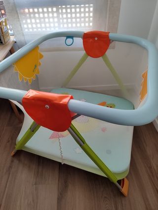 Preciosa minicuna de viaje para bebé, ideal para viajes o para tener una cama extra en casa. Se encuentra en muy buen estado. - Incluye cambiador. - Tiene un práctico bolsillo lateral. - Arco de juegos incluido. - Fácil de montar y desmontar.