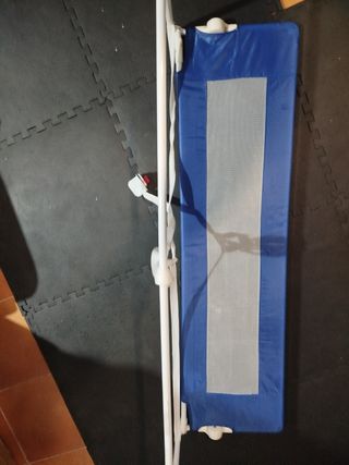 Protector lateral para cama infantil, en buen estado. 1'40 de largo y 40 de alto (medidas estándar) - Color azul. - Estructura metálica blanca. - Fácil instalación con correas. - Ideal para evitar caídas.