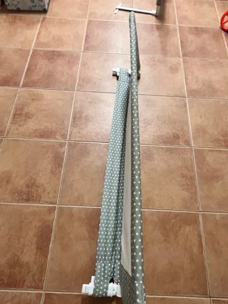Barrera de seguridad para cama infantil, diseñada para prevenir caídas. - Estructura de metal. - Tejido de malla transpirable con estampado de estrellas grises. - Incluye funda de transporte.