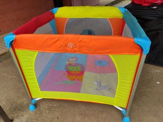 Parque infantil cuadrado marca Asalvo. Colores alegres y con dibujos de animales fácil de plegar. Buen estado