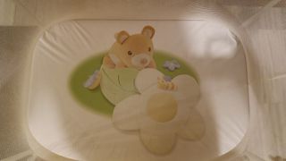 Parque cuna de tela azul y verde con colchoneta. - Colchoneta con diseño infantil.