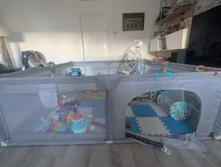 Parque infantil ideal para que los más pequeños jueguen con seguridad. Por si forma ajusta bien a los sitios. La cremallera está rota, solo hay que cambiarla, yo colocaba la puerta en el lado de la pared para que no se saliera el niño, por el resto está en buen eatado