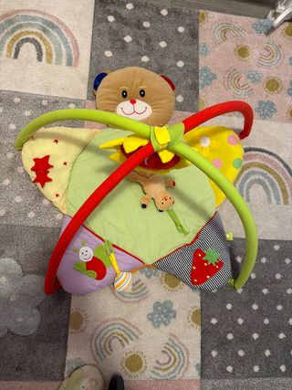 Parque de actividades para bebés con un diseño colorido y divertido. - Incluye un peluche de oso. - Incorpora varios juguetes colgantes. - Base acolchada con diferentes texturas y estampados.