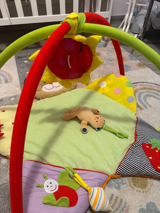 Alfombra de actividades para bebés, ideal para el juego y el desarrollo. - Diseño multicolor con motivos infantiles. - Incluye dosel y varios juguetes colgantes.