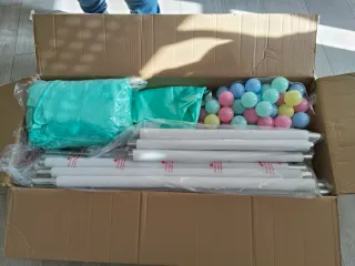 Se vende parque infantil para bebés, ideal para que los más pequeños jueguen de forma segura. Incluye una bolsa de pelotas de colores. - Estructura de tubos metálicos. - Tela de color turquesa. - Pelotas de plástico en varios colores (azul, rosa, amarillo, verde claro). Con bolas y colchoneta
