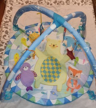 Parque de juegos y gimnasio para bebés con arco de actividades y colchoneta. - Colchoneta con diseño colorido y acolchado. - Arco con varios juguetes colgantes. - Estructura de soporte para colgar los juguetes.