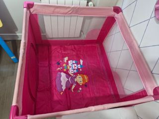 Parque infantil cuadrado de la marca Asalvo Baby, ideal para los más pequeños. Su diseño es práctico y seguro. Esta usado y un poco sucio por lo que ha estado guardado - Color rosa. - Estructura resistente. - Laterales de malla transpirable. - Dibujo de princesa y castillo en el frontal.