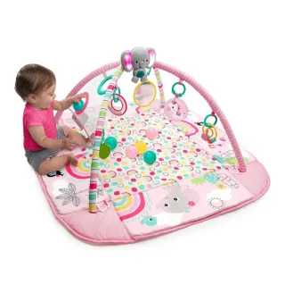 Parque de juegos para bebés en color rosa, con arcos y juguetes colgantes. - Diseño acolchado y suave. - Incluye peluches y texturas. - Ideal para el desarrollo y entretenimiento del bebé.