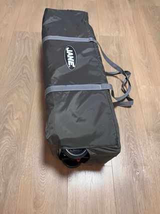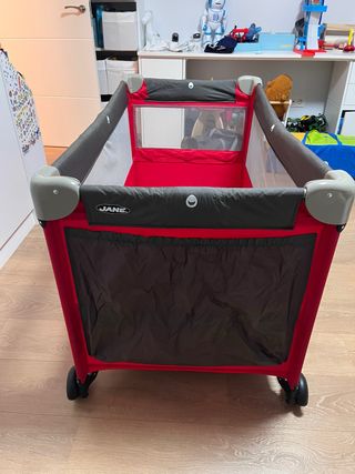 Parque infantil y cuna de viaje de la marca Jane. Ideal para transportar y usar en diferentes lugares. - Estructura plegable. - Laterales de malla transpirable. - Bolsillo lateral. - Ruedas para facilitar el desplazamiento.