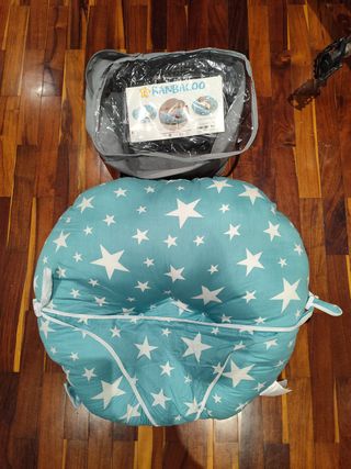 Tumbona-cojín Banbaloo para recién nacidos. Es suave y confortable. En color azul clarito con estrellas. La tumbona Banbaloo para recién nacidos es un nido perfecto para el bebé. Su exclusivo centro hace que el pequeño se sienta cómodo y seguro, al no permitir volcarse y dando a los papás una libertad que les permitirá tener las manos libres sin tener que dejar al niño en el moisés,cuna o parque de juegos. Al ser más ancho de la parte de la cabeza que de las piernas, el sillón ergonómico hace que el bebé descanse en un ángulo perfecto mientras está despierto y hace que pueda observar su alrededor sin tener que estar tumbado.