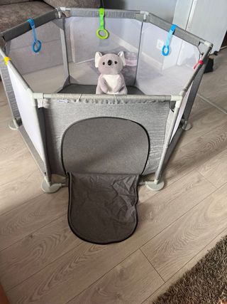 Parque infantil de tela gris, ideal para que los más pequeños jueguen de - Estructura plástico y tela resistente. - Diseño moderno y funcional.