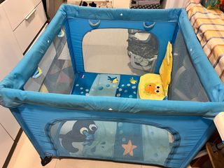 Parque infantil de la marca Chicco en color azul. - Diseño con temática marina. - Malla transpirable en los laterales. - Gatera con cremallera para fomentar la autonomía del niño/a (ver fotos) - Incluye alfombra de temática marina, que se puede retirar (ver fotos) - Incluye funda de transporte e instrucciones (ver fotos). - Logo de la marca visible (ver fotos) - Hay 4 anillas de tela para que el niño/a pueda practicar el ponerse de pie (ver fotos). - desperfecto en ultima foto: pellizcó al estar en trastero - Se ha limpiado al sacarlo del trastero - Tiene mucha vida aún - medidas 95 x95cm, de altura 72 cm