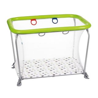 Parque infantil. En muy buen estado. De forma rectangular con unas medidas de 120x60. Tanto el borde como la base están acolchados. Tiene cuatro anillas para ayudar al bebé a ponerse de pie. Los laterales son de malla, lo que permite tener una visión completa. Se puede plegar.