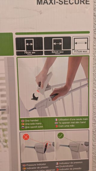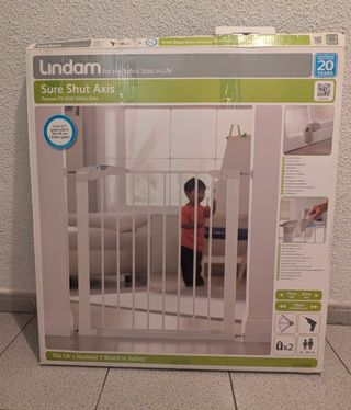 Valla de seguridad para puerta de la marca Lindam. Color blanco, con doble sistema de cierre y apertura en ambas direcciones. Para puertas de entre 75 y 82 cm. Instalación sin necesidad de taladro. En buen estado.