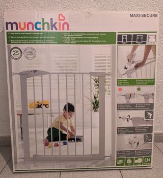 Valla de seguridad para puerta de la marca Munchkin. Color blanco, con doble sistema de cierre y apertura en ambas direcciones. Para puertas de entre 76 y 82 cm. Instalación sin necesidad de taladro. En buen estado.