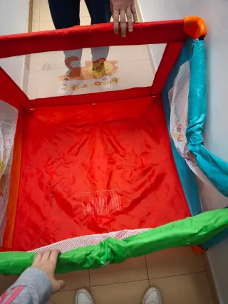 Parque infantil de varios colores. - Estructura de tela y malla. - Laterales de color naranja, azul y verde. - Base de color rojo.