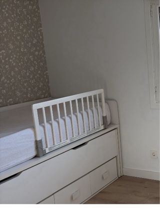 Barandilla de seguridad para cama infantil, ideal para evitar caídas durante la noche. - Color blanco. - Diseño de barrotes.