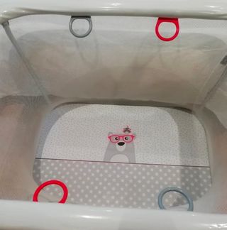 Parque cuna de la marca Olmitos con un divertido diseño infantil. - Estructura colorida con animales. - Laterales de malla transpirable. - Base acolchada. - Ruedas para facilitar el desplazamiento.