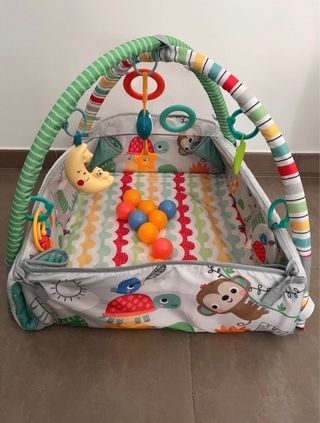 Diversión con esta manta de juegos - piscina de bolas. Fácil de transportar para que puedas llevarla donde quieras. Papá y mamá se lo pasarán en grande encestando las bolas por el agujero de la malla, y el bebé podrá practicar sus habilidades motoras encestando las bolas una y otra vez. Puede usarlo con la manta extendida para que juegue tumbado o en modo corralito para jugar sentado. Incluye 5 juguetes y bolas de colores. Usado cuatro o cinco veces en total.