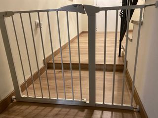 Puerta de seguridad para el hogar. - Barrera de metal blanco. - Ideal para niños y mascotas. Tiene un extensor para huecos más grandes (cómo se observa en la parte izquierda de la primera foto). Sólo la puerta abarca desde los 76 hasta los 80 cm. El extensor nos dará unos 10 cm más. Muy segura y tiene apertura tanto hacia afuera como hacía adentro.