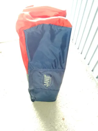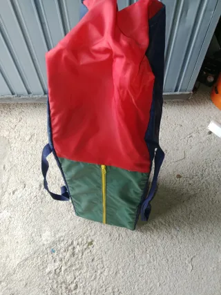 Este es un parque infantil. - Tejido de color rojo y verde. - Cremallera amarilla. - Correas azules.