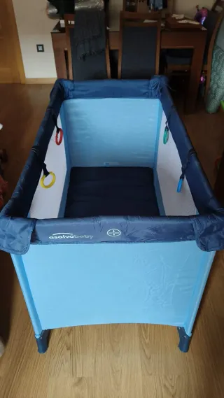 Parque cuna de la marca Asalvo Baby en color azul. Ideal para el descanso y juego del bebé. Solo tiene un agujerito pequeño en la malla lateral. Colchón no incluido. - Laterales de malla transpirable. - Incluye 3 anillas de sujeción. - Plegable para fácil transporte y almacenamiento.