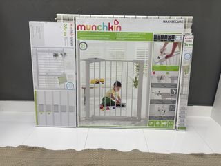 Barrera de seguridad infantil de la marca Munchkin en color blanco. Incluye extensiones para adaptarse a diferentes espacios. - Barrera de presión sin taladro. - Fácil de instalar y desinstalar. - Diseño seguro para niños. Lo he comprado por 89,57€ y no he llegado a usarlo.