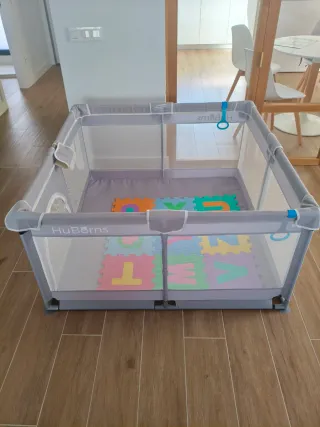 Parque infantil de la marca HuBorns, ideal para que los más pequeños jueguen de forma segura. Incluye un suelo acolchado con piezas de puzzle. - Dimensiones 120*120 cm - Laterales de malla transpirable. - Puerta de acceso con cremallera.